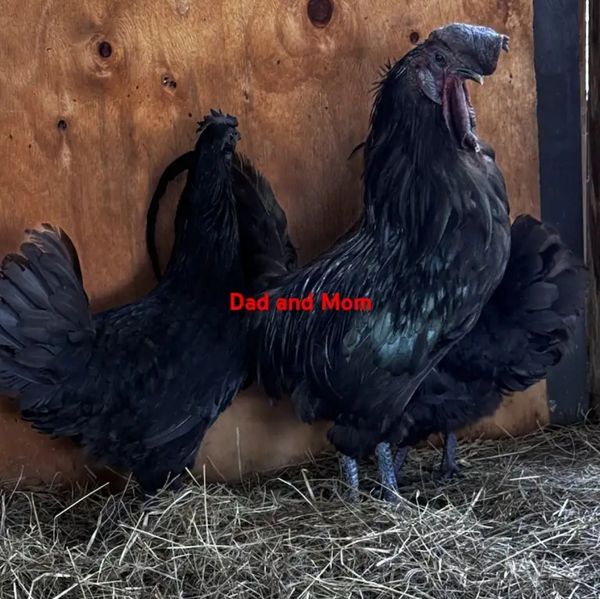 Midnight Ranch breeds the Svart Hona × Ayam Cemani hybrid — a calm, hardy, heat-tolerant fibromelanistic bird